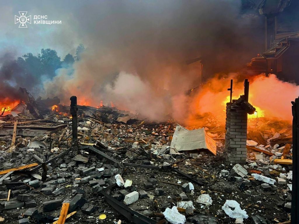 У селі Долина Обухівського району сталося загорання у 2 тимчасових спорудах, загинули 2 осіб. У селі Мархалівка Фастівського району – один загиблий, 8 постраждалих (серед них одна дитина), 3 будинки зруйновано, спалахнули пожежі ще у 2 будинках. У селищі Макарів Бучанського району один загиблий один травмований. Там спалахнула пожежа та сталося руйнування будинку. У селі Чмирівка Білоцерківського району – 5 травмованих (серед них двоє дітей), спалахнула пожежа, пошкоджено два будинки. У Білій Церкві уламками безпілотника травмовано чоловіка, зруйновано каркасний цех. У Броварському районі виникли пожежі у 2 складських будівлях.