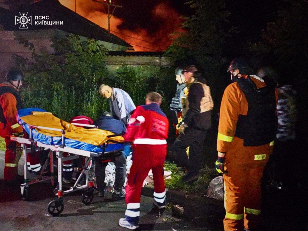 Про це повідомила Вікторія Рубан, речниця ДСНС України в Київській області. За її словами, травми отримали двоє рятувальників, які саме гасили пожежу на місці атаки. Їх стан задовільний, вони наразі залишаються у медичному закладі.