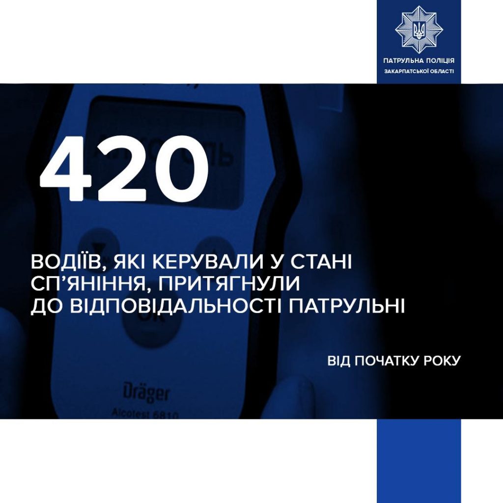 Від початку року патрульні поліцейські Закарпатської області притягнули до відповідальності за нетверезе керування 420 водіїв.