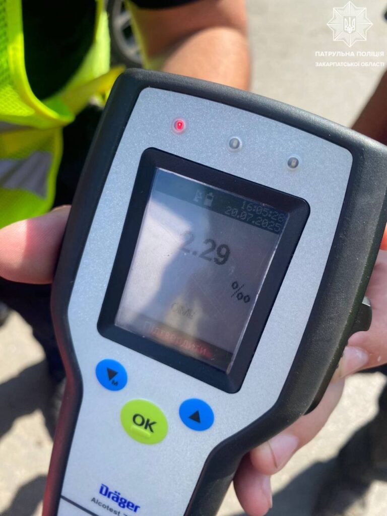 Під час спілкування з винуватцем події патрульні помітили ознаки алкогольного сп’яніння. Водій погодився на проходження тесту. Результат — 2,29‰.