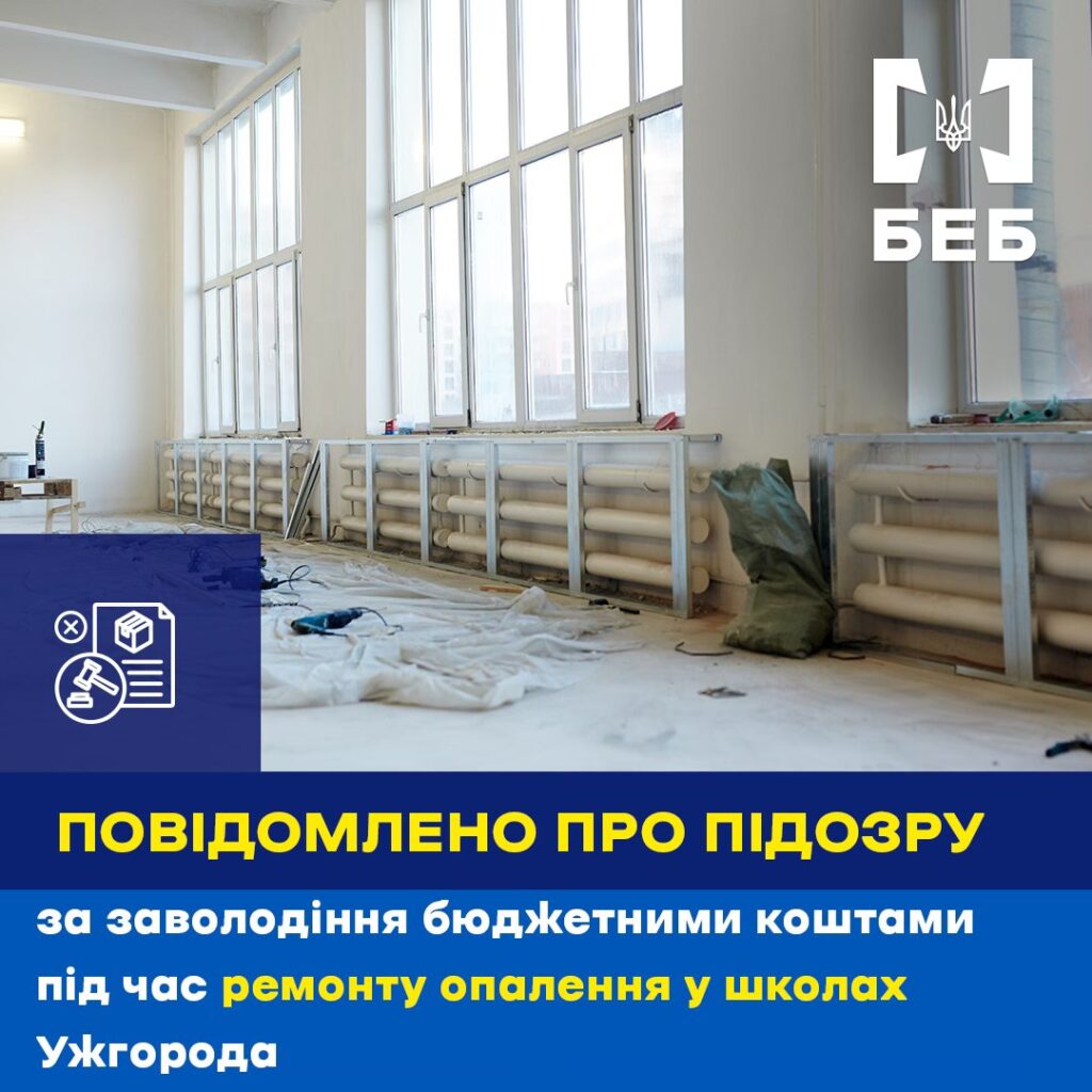 Детективи ТУ БЕБ у Закарпатській області за процесуального керівництва обласної прокуратури повідомили про підозру посадовцю Ужгородської міської ради та підприємцю. Їх підозрюють у привласненні бюджетних коштів під час проведення капітального ремонту системи опалення у комунальних закладах освіти міста Ужгород у 2023 році.
