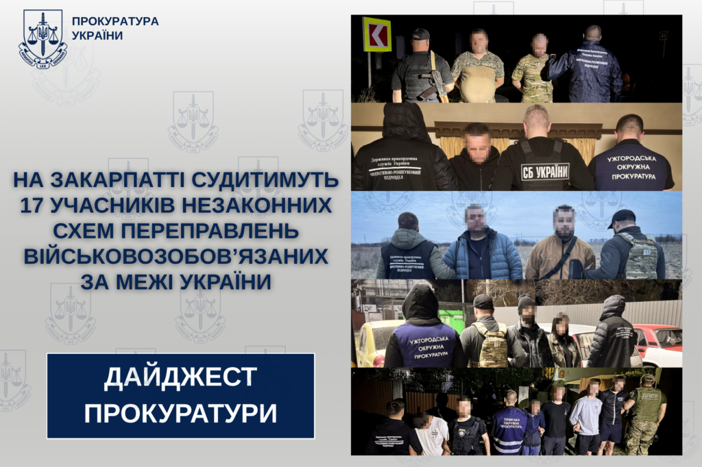 Упродовж поточного тижня прокурорами Закарпаття скеровано до суду обвинувальні акти стосовно 17 осіб, які намагались незаконно організувати та переправити через держкордон військовозобов’язаних. Загальна сума неправомірних вигод, на які розраховували зловмисники – понад 73 тис дол. США. Загалом, не допущено втечу більше 18 чоловіків мобілізаційного віку.