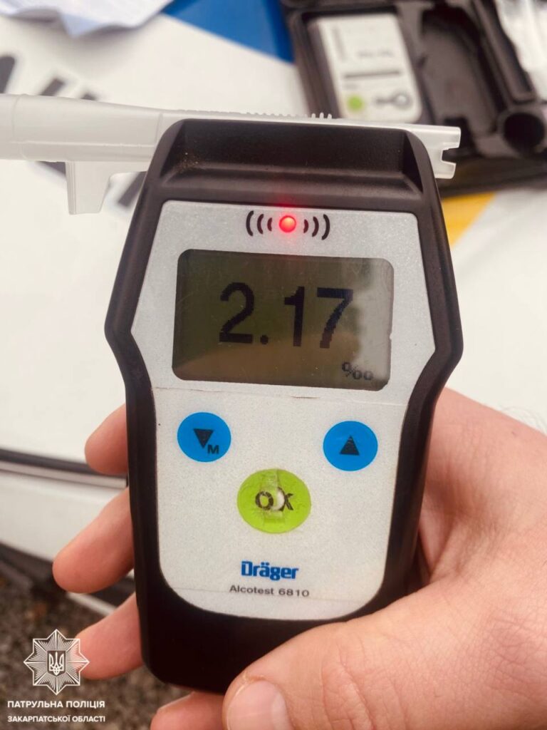 Під час спілкування з водієм поліцейські помітили у нього ознаки алкогольного сп’яніння. На місці зупинки провели огляд на стан сп’яніння, результат якого виявився позитивним — 2,17 ‰.