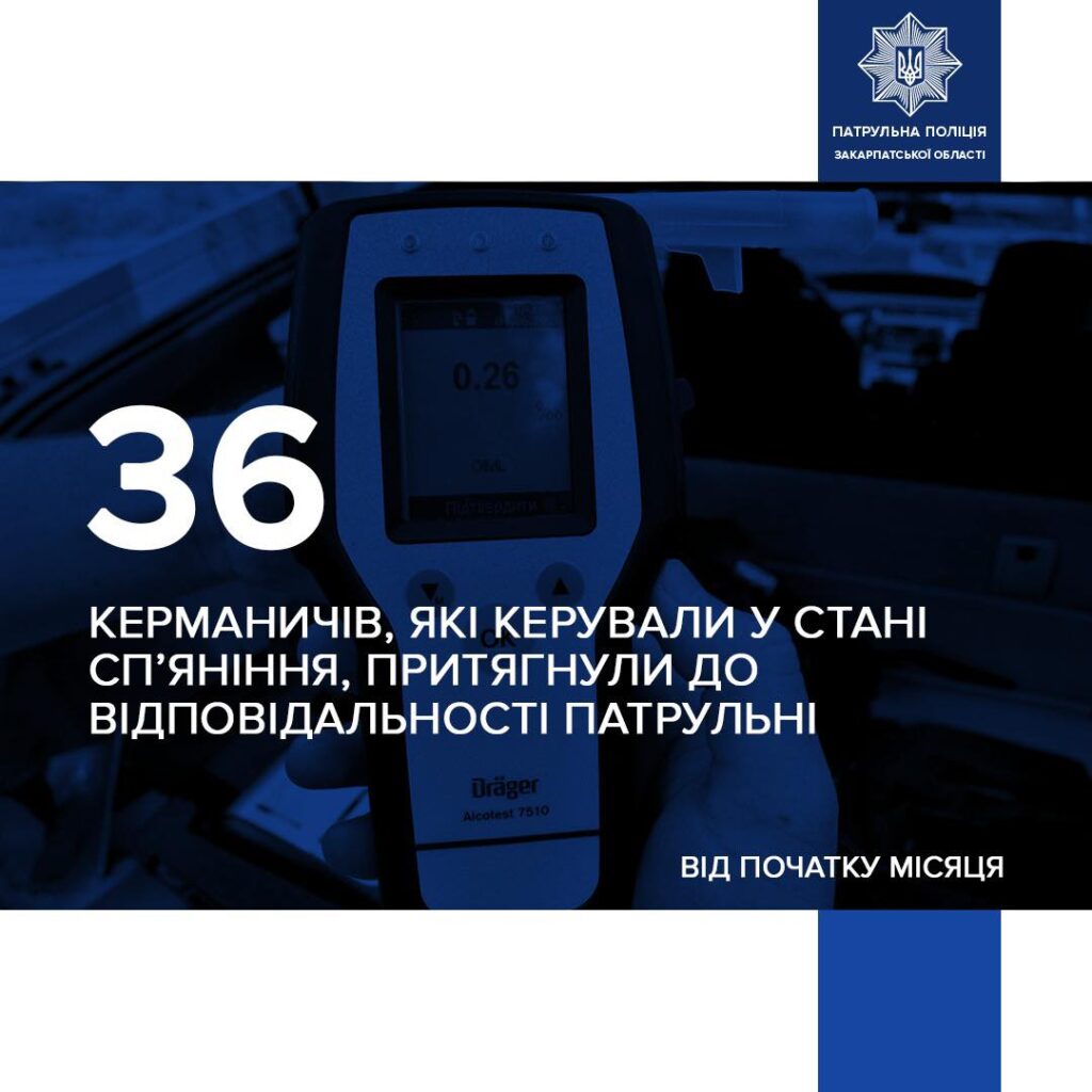 Від початку місяця закарпатські патрульні притягнули до відповідальності за нетверезе керування 36 водіїв.