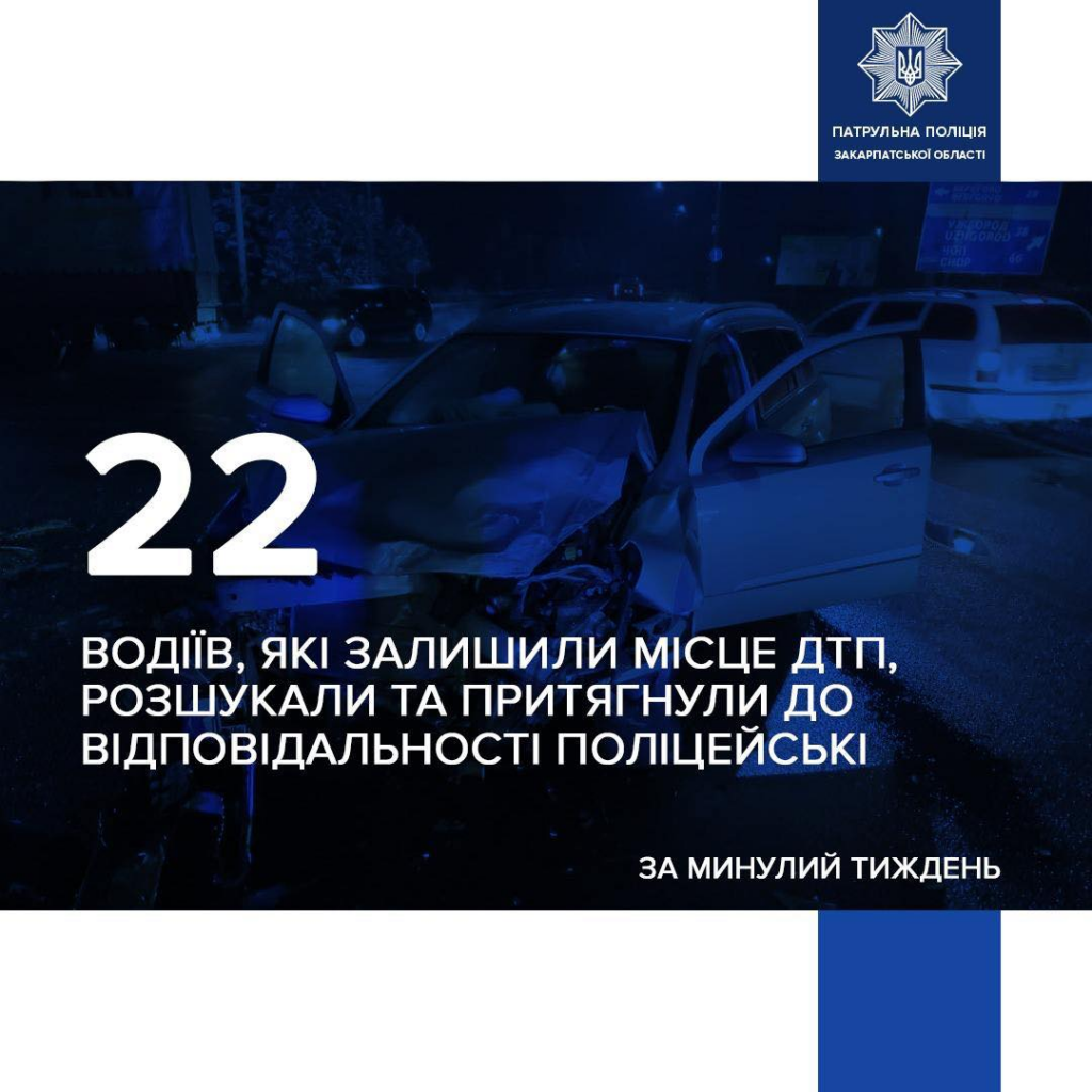 За минулий тиждень поліцейські Закарпатської області встановили та розшукали 22 водіїв, які після скоєння дорожньо-транспортних пригод залишили місце аварії.