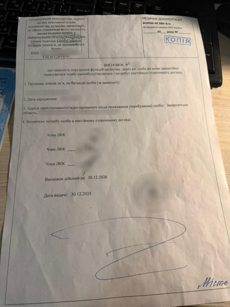 У другому випадку чоловік, що виїжджав через автомобільний пункт пропуску «Чоп (Тиса)», надав інспекторові на контроль документи про здійснення ним постійного догляду за батьком. Втім, під час їх перевірки прикордонний наряд виявив, що висновок ЛКК є невстановленого зразку. У ході проведення перевірочних заходів також було встановлено, що пред’явник документів не був присутній під час їх оформлення та видачі.