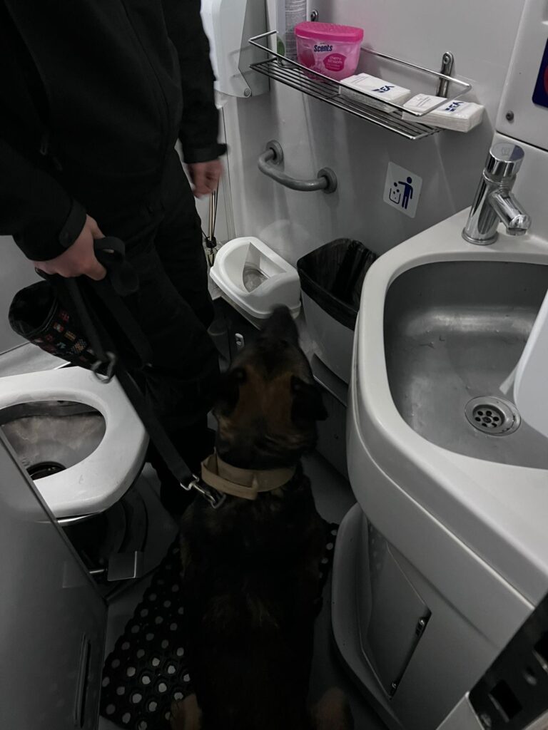 Під час перевірки вагона службовий собака прикордонників зреагував на сторонні речовини. Після ретельнішого огляду у сміттєвому баку знайшли два флакони лікарських засобів: «Frontin 0,5 mg» у кількості 100 таблеток та «Rivotril 0,5 mg» — 50 таблеток. Ці препарати містять психотропні речовини Alprazolam і Klonazepam.