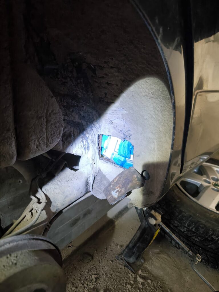 Аби дістатись до них, довелось демонтувати задні колеса та підкрильники з викручуванням 8-ми гвинтів, замасковані герметиком, які тримали дві металеві пластини. Так відкрився доступ до ніші сховищ, де знаходились заздалегідь загорнуті в поліетиленовій плівці тютюнові вироби, закріплені між собою мотузкою.