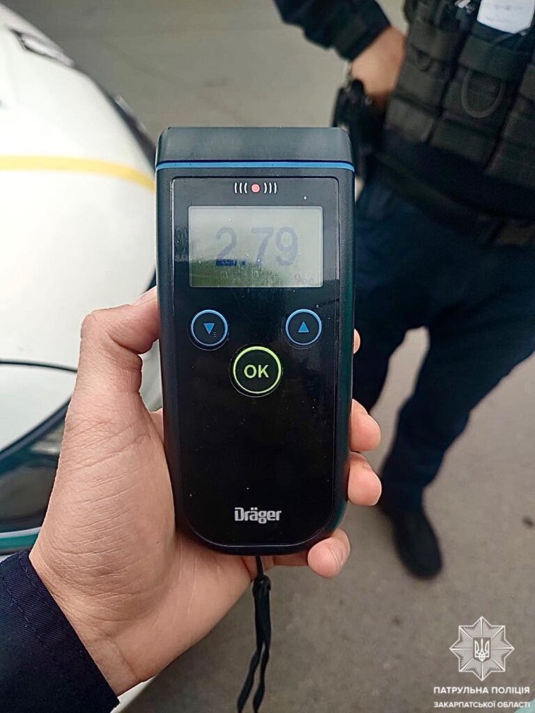 Жінка погодилася пройти огляд на стан сп’яніння на місці. Результат позитивний — 2,79 ‰ алкоголю в крові, що майже у 14 разів перевищує допустиму норму.