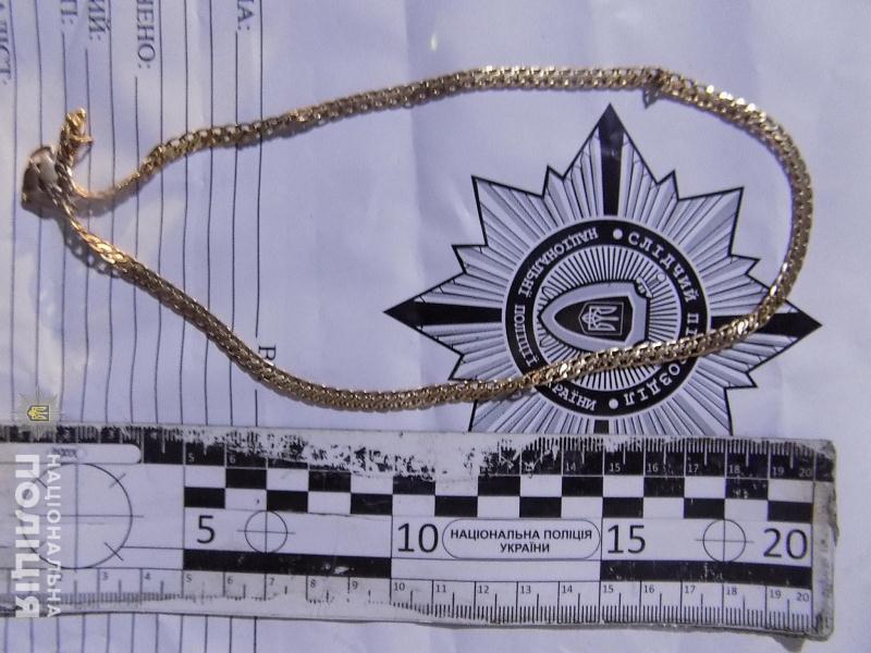 Вчора, 22 жовтня, близько 21:45 год до поліції надійшло повідомлення про грабіж по вул. Бородіна в місті Ужгород. Потерпіла, 41-річна місцева мешканка, повідомила, що невідомий чоловік спричинив їй тілесні ушкодження, зірвав з шиї золотий ланцюжок та відібрав сумку, в якій були гроші та документи.